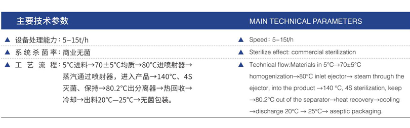 概述:产品先经预热后,蒸汽直接喷入产品,使产品在瞬时被加热到设定温度,经过一定时间的保温后,通过真空分离器把产品瞬间降温,并等量蒸发掉因蒸汽喷入增加的水分,最后产品在无菌条件下冷却、灌装。